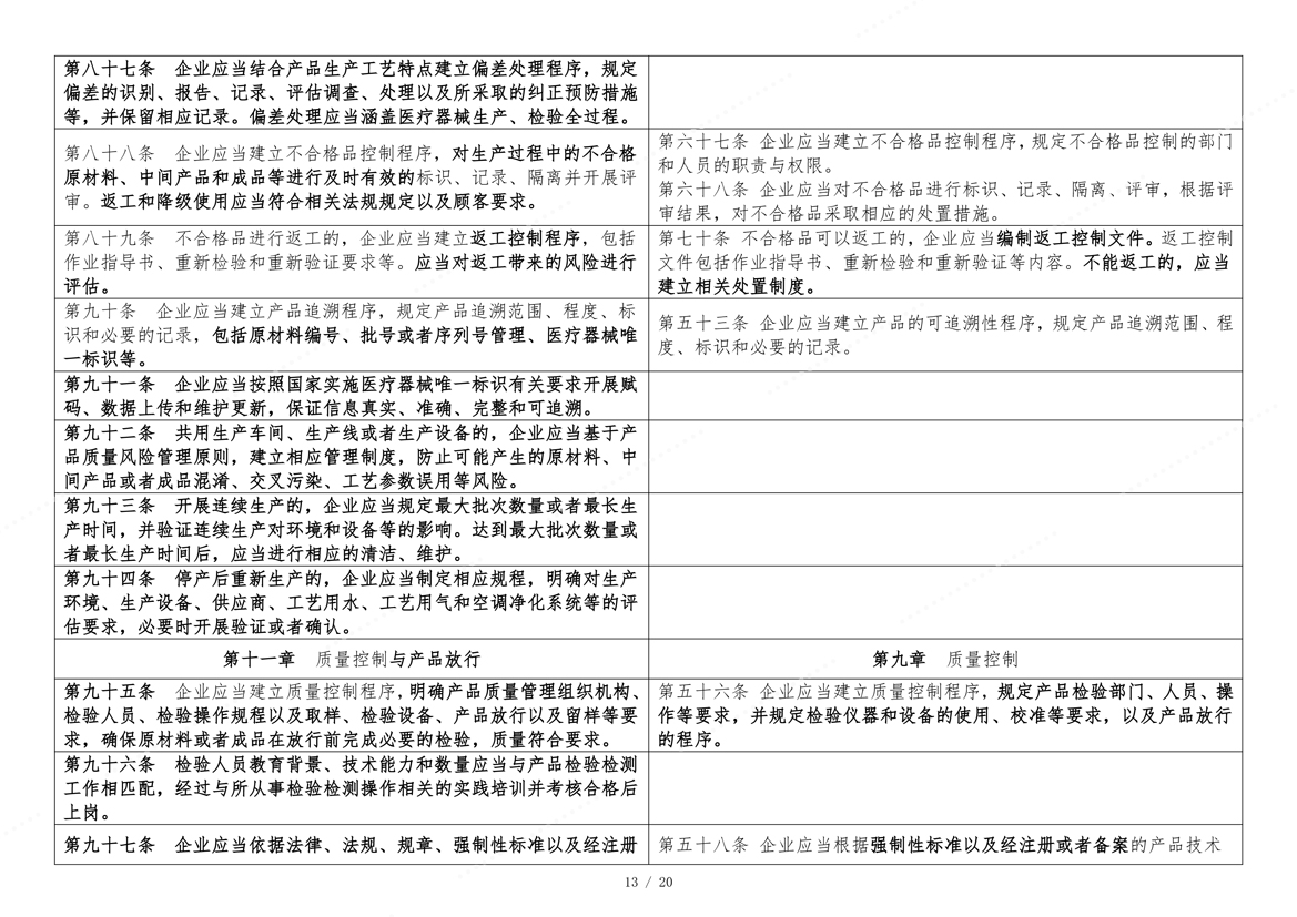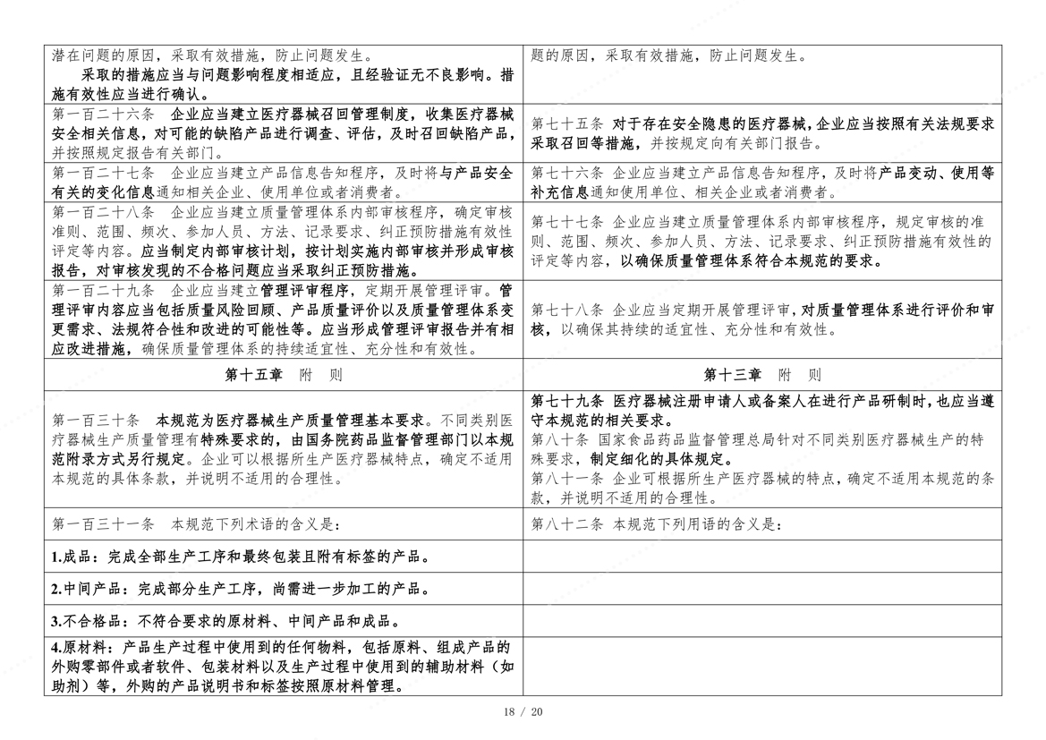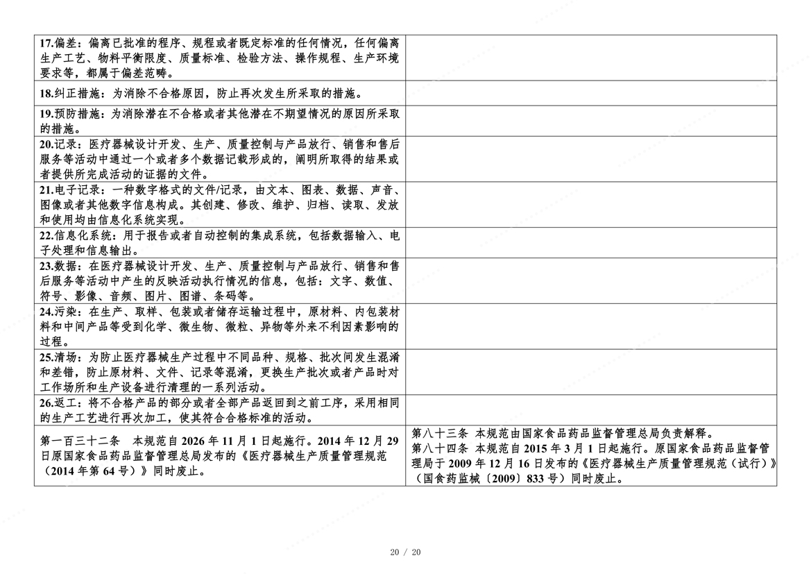 国家药监局于2025年11月4日在官网发布《医疗器械生产质量管理规范》。为方便大家了解新修订《医疗器械生产质量管理规范》的主要变化,核查中心组织对《医疗器械生产质量管理规范》修改前后进行了对比。现全文刊登如下,供大家学习参考。