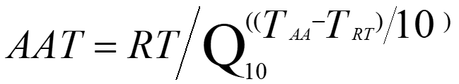 Q10:温度升高或降低10℃的老化系数(一般取2);